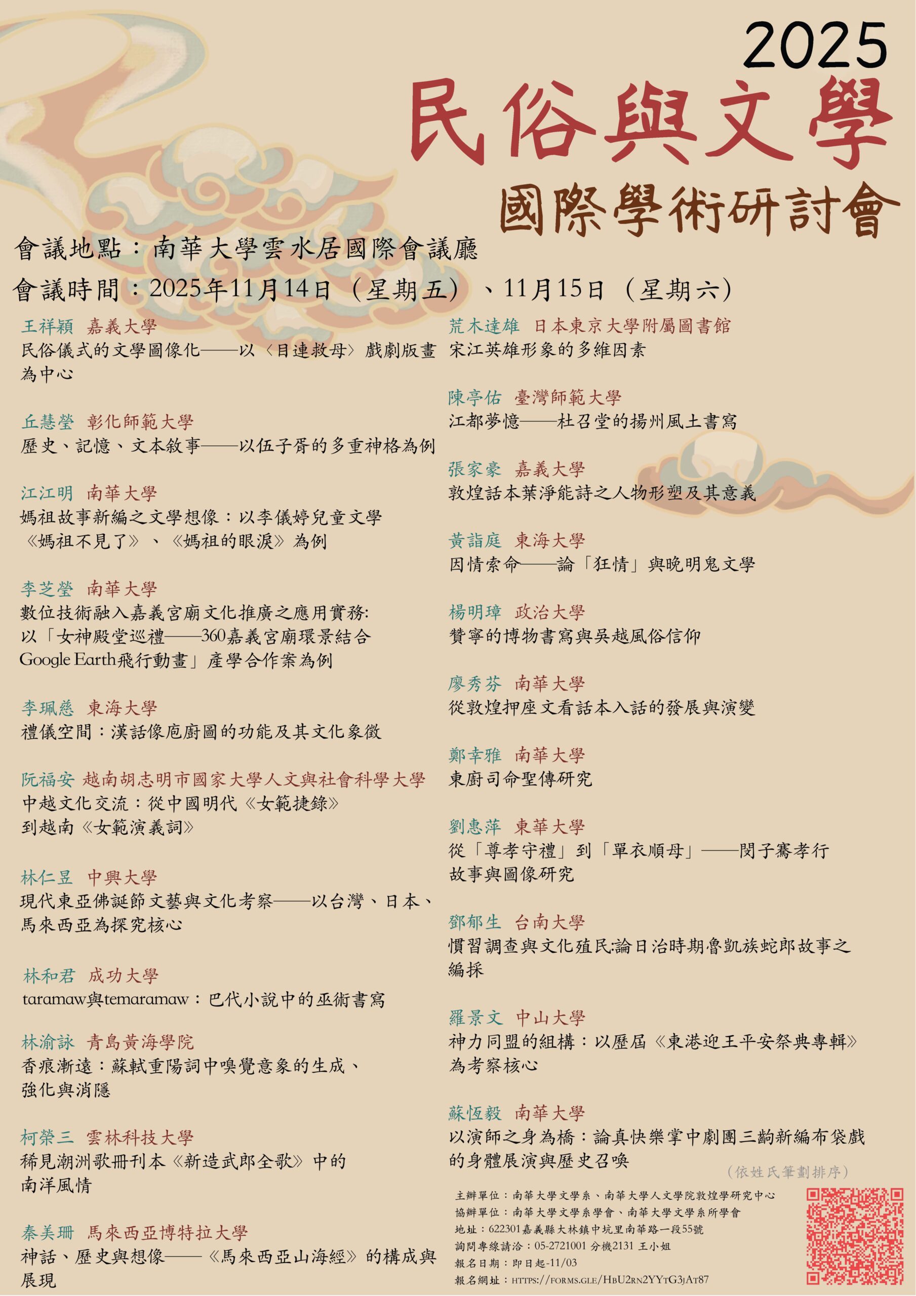 荒木特任研究員が、11月14日‐15日に台湾・嘉義県の南華大学で開催された「2025民俗與文學國際學術研討會」にて研究報告者とコメンテーターを務めました。