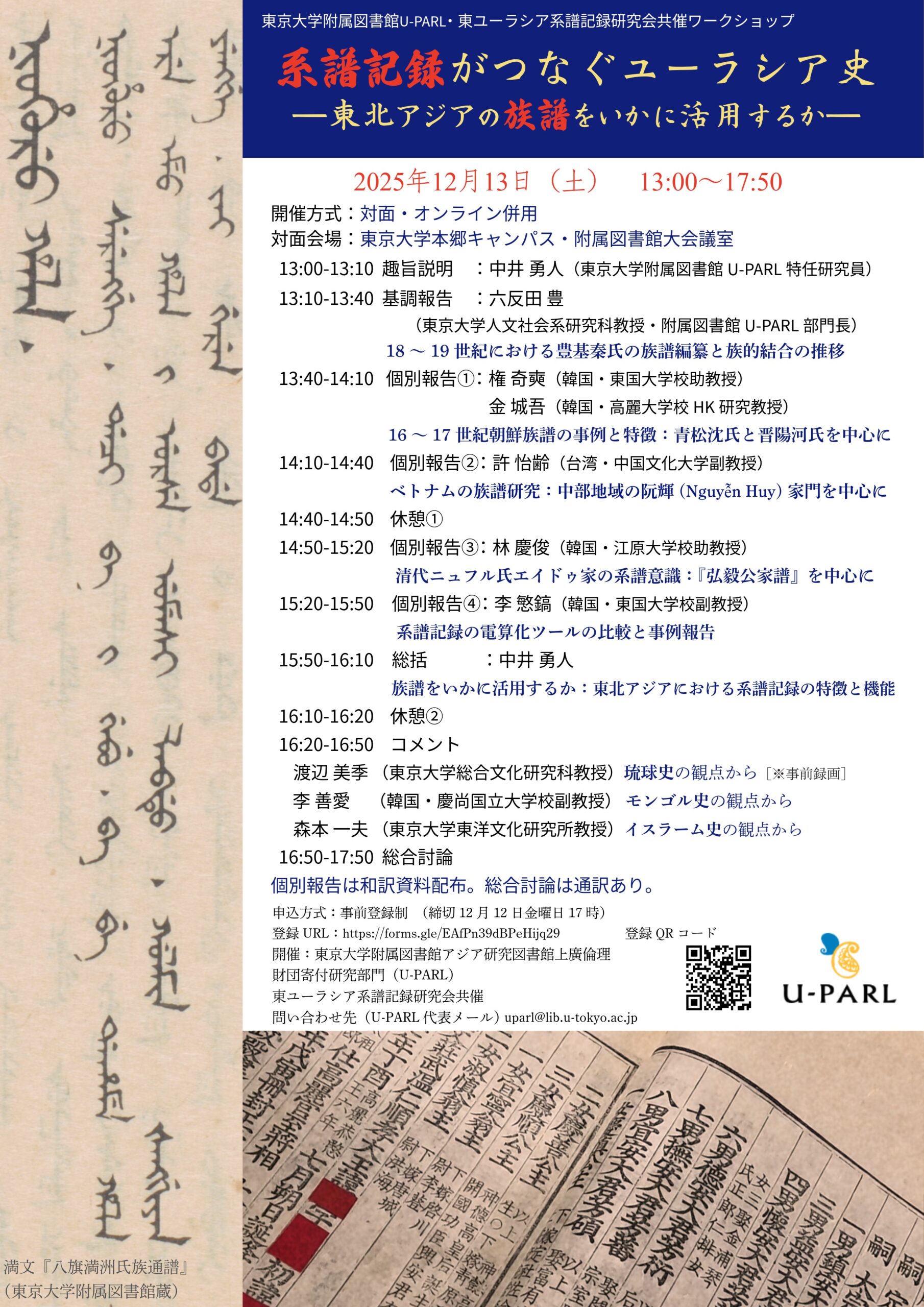 開催主体:東京大学附属図書館アジア研究図書館上廣倫理財団寄付研究部門(U-PARL)・東ユーラシア系譜記録研究会 共催